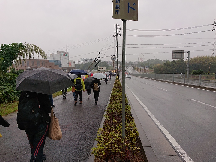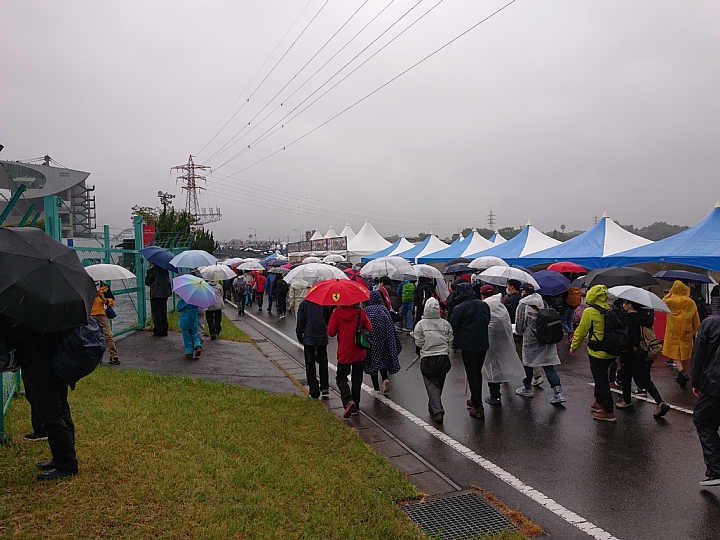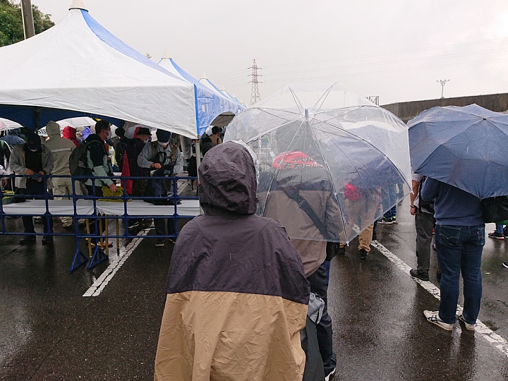 この日は残念ながらそれなりの雨だったので、移動時やサーキットのブース巡り時、スタンド観戦&撮影時の雨具を意識していたんですが・・・ 松阪駅へ向かう時点で折り畳み傘が破損(柄が伸びなくなってしまい、それに伴って傘が開いた状態にならなくなってしまった)し使い物にならなくなってしまいました(T_T) そんな訳でこの日は鈴鹿サーキット稲生駅のテントで雨具(安い使い捨てのポンチョ)を装着。今思えばもうちょっとしっかりしたものを着ておけば良かったんですけどね・・・